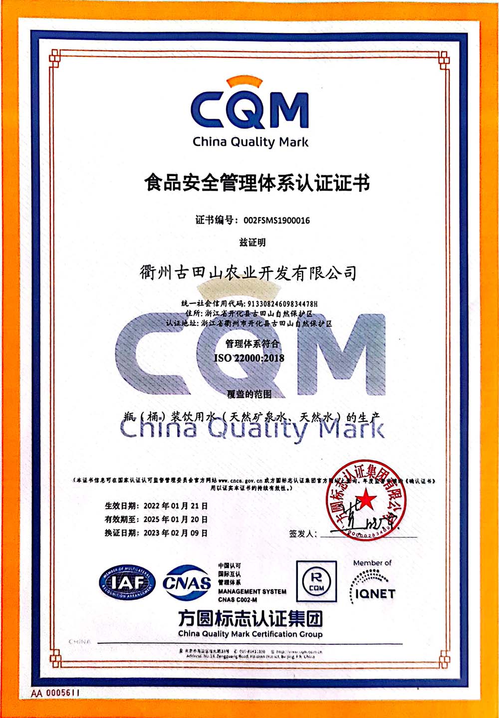 食品安全管理体系认证书